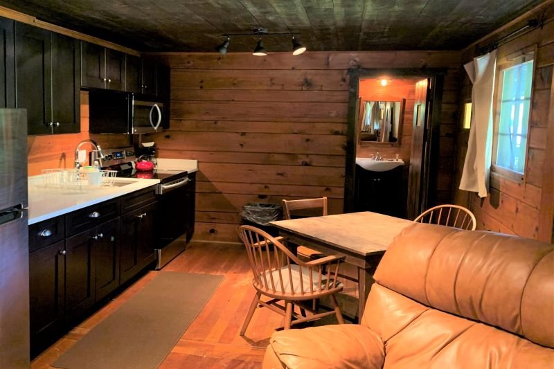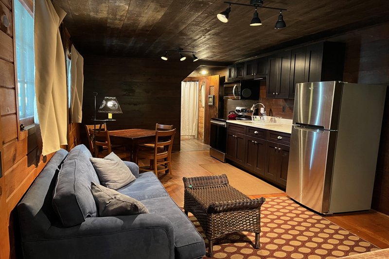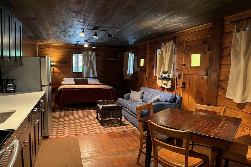 Spacious one-room with a new full kitchen, queen bed, loveseat and large private bath with over-sized shower. Covered deck space with chairs. There are no children or infants allowed in the deck rooms.