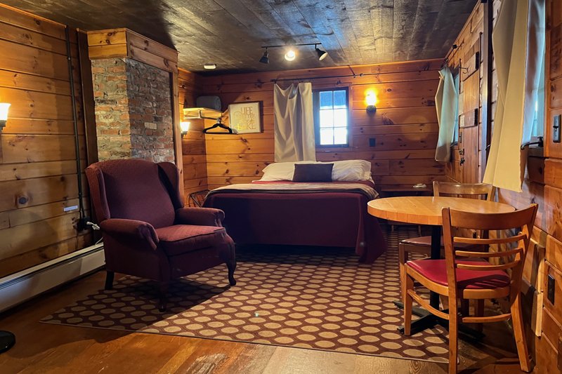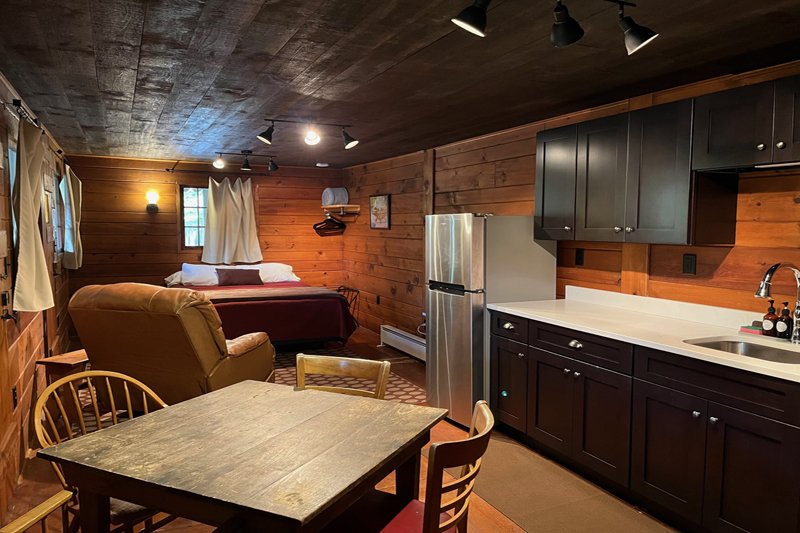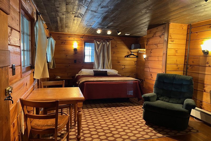 Spacious one-room with a new full kitchen, queen bed, comfortable reading chair and large private bath with over-sized shower. Deck space with a lake view and chairs for you to comfortably enjoy. There are no children or infants allowed in the deck rooms.