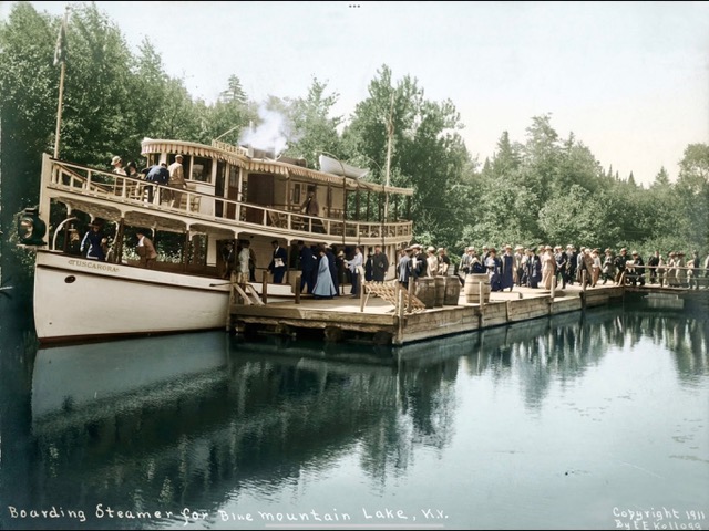 The travelers who went to Raquette Lake took a steamboat across Raquette Lake and through the Marion River. Passengers there boarded a one three-quarter, two-car train to another steamboat. This steamboat at the head of the Marion River Carry would bring passengers through the lakes of Utowana, Eagle, and ultimately to their destinations in Blue Mountain.